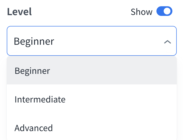 1. Level: Toggle “Show” button on to display the difficulty of the program to your users (Default is off). You can select among the 3 levels: