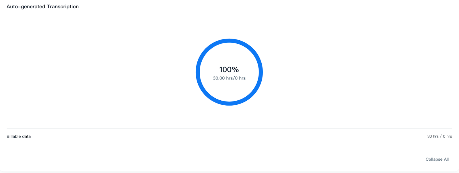 然後,當您點擊“展開全部”時,您可以確認源字符、可計費存儲和自動生成的轉錄的摘要。