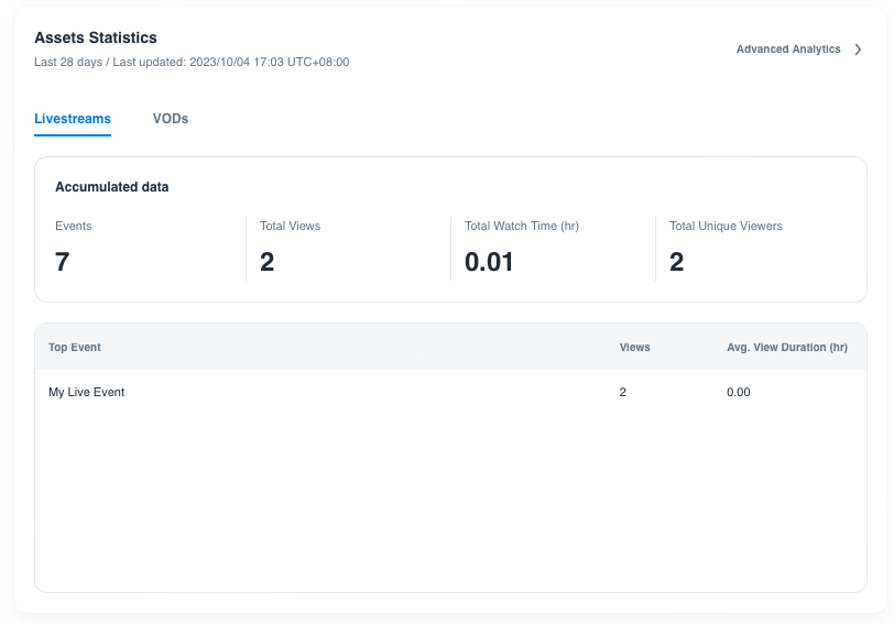 此部分通過“直播”和“VOD”選項卡提供過去28天內您過去的現場活動和已轉檔的VOD的概覽。