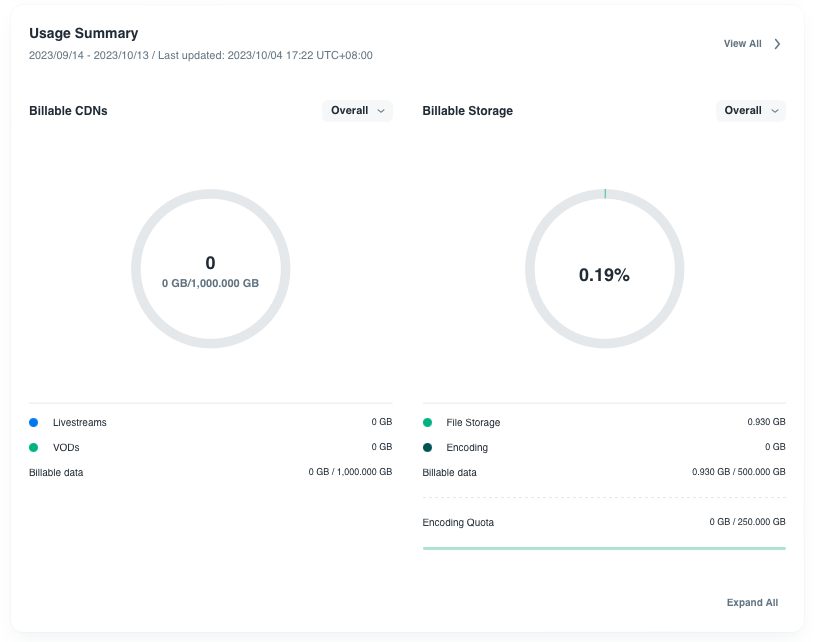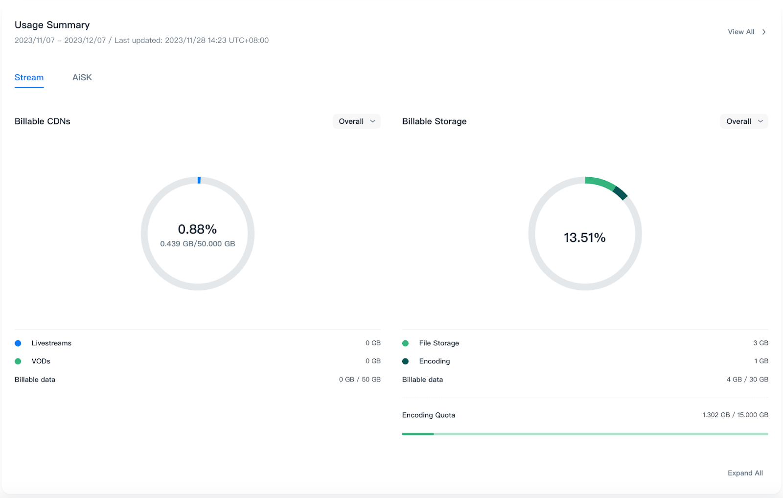 此部分顯示了您的流的估算可計費使用的摘要,並包括CDN、存儲、直播時數和DRM請求,以及AiSK整體使用的圖形(點擊底部的“展開全部”以顯示完整的信息)。