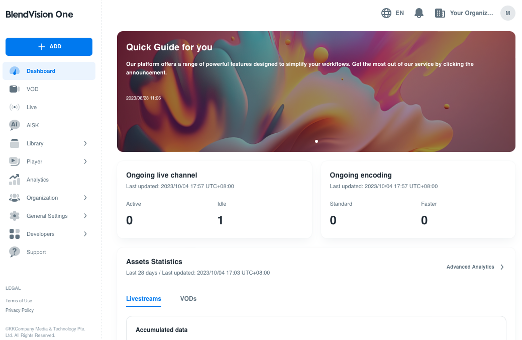 這個集中式的中樞擔任您監控需求的指揮中心。從儀表板模組,您可以輕鬆地在各個部分之間導覽,獲得BlendVision One的最新消息和您的直播/VOD使用情況的即時概述。