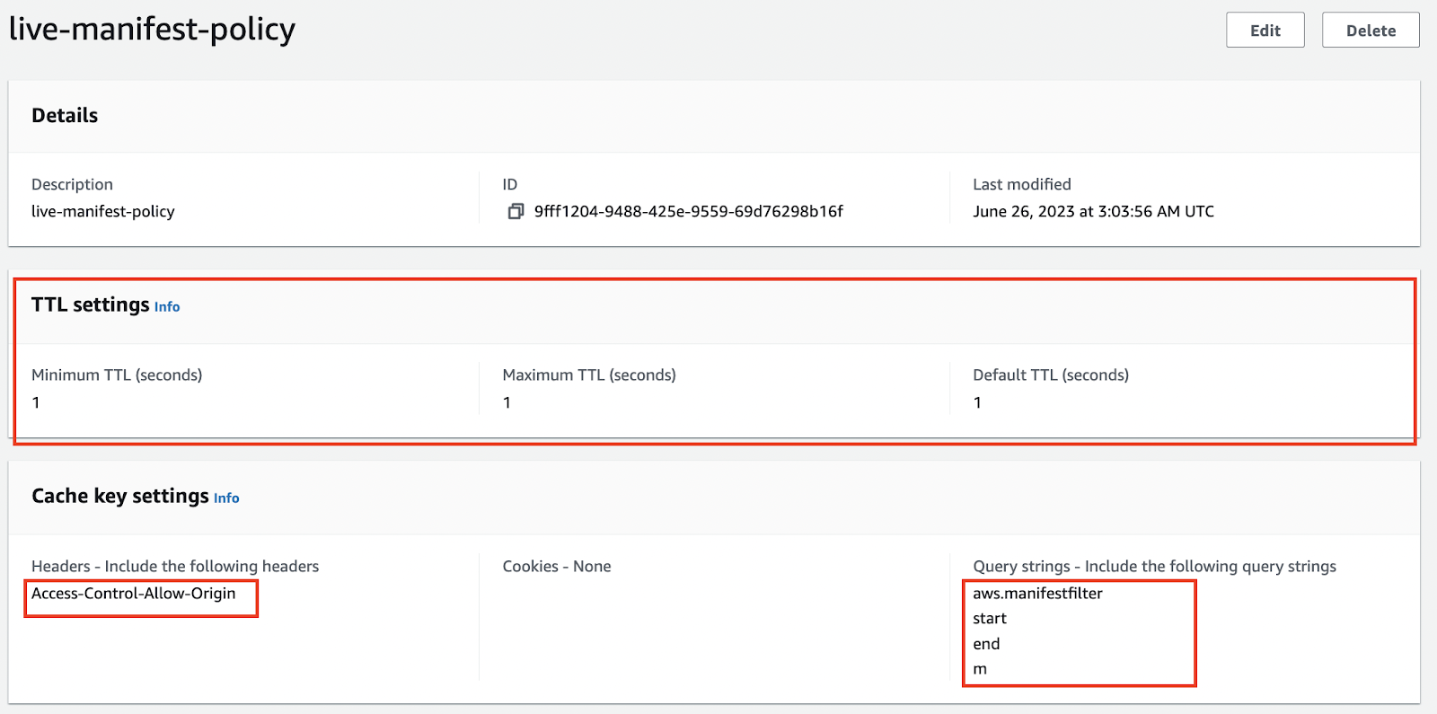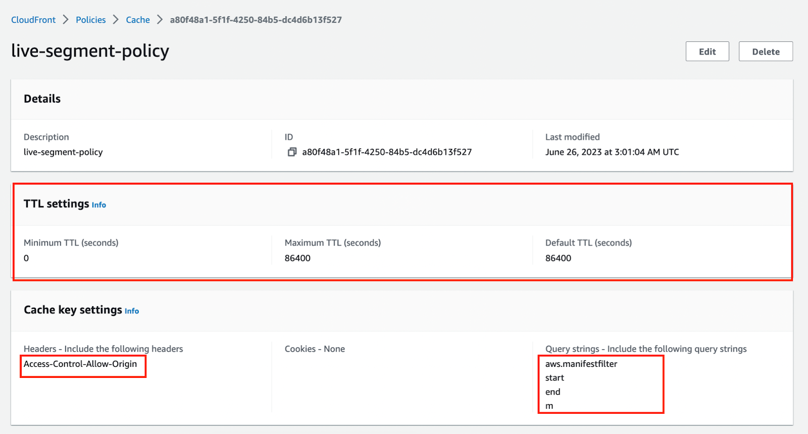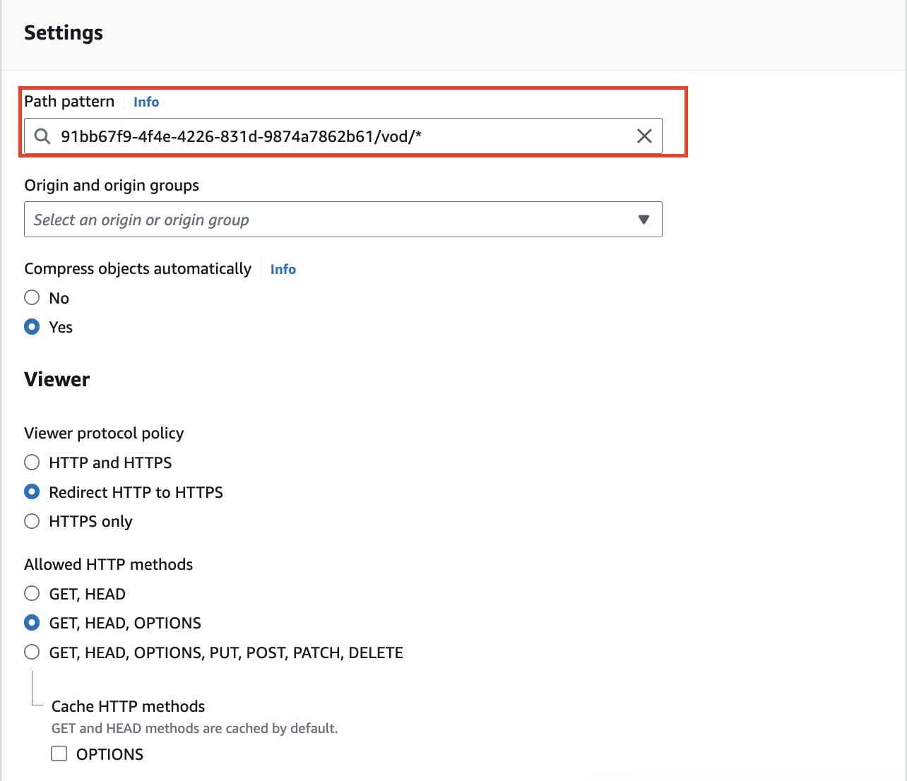 - 91bb67f9-4f4e-4226-831d-9874a7862b61/vod/*.m3u8 (select the VOD manifest policy as Cache policy)