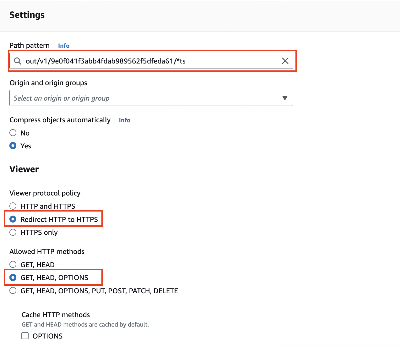 - out/v1/9e0f041f3abb4fdab989562f5dfeda61/*.m3u8 (select the live manifest policy as Cache policy)