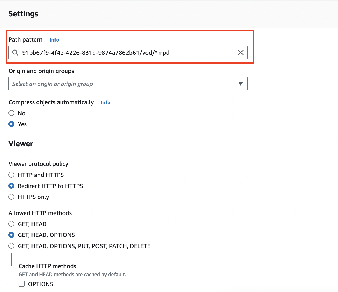 - 91bb67f9-4f4e-4226-831d-9874a7862b61/vod/*.mpd (select the VOD manifest policy as Cache policy)