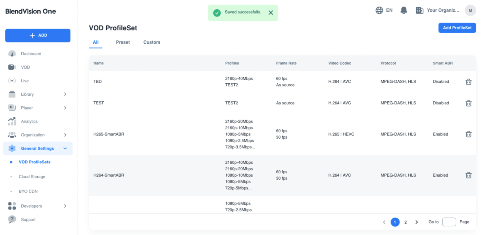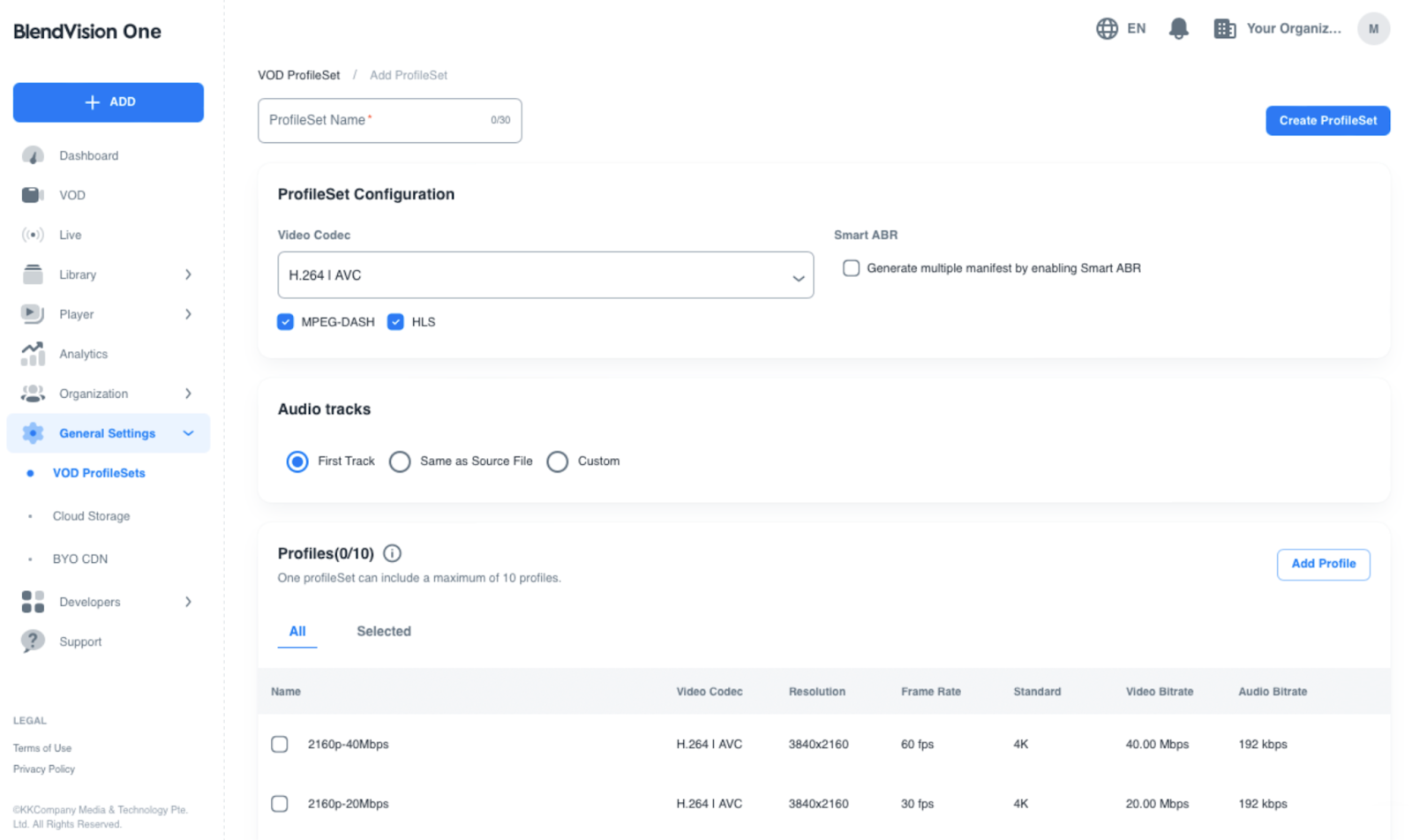 在 BlendVision One 中,您需要將輸出解析度和比特率定義到 ProfileSet 中,以確定每個 VOD 的轉檔輸出的編解碼器和串流協議。BlendVision One 提供了讓您可以通過自定 ProfileSets 或使用我們提供的預設,輕鬆製作適應性串流。