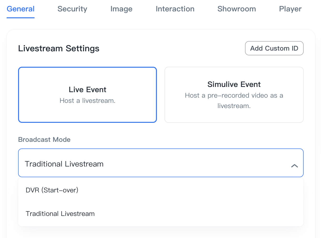 注意:此模式僅適用於模擬直播活動。如果您想將直播信號記錄為可播放的點播,請查看本文中的VOD部分或將直播活動用作VOD。