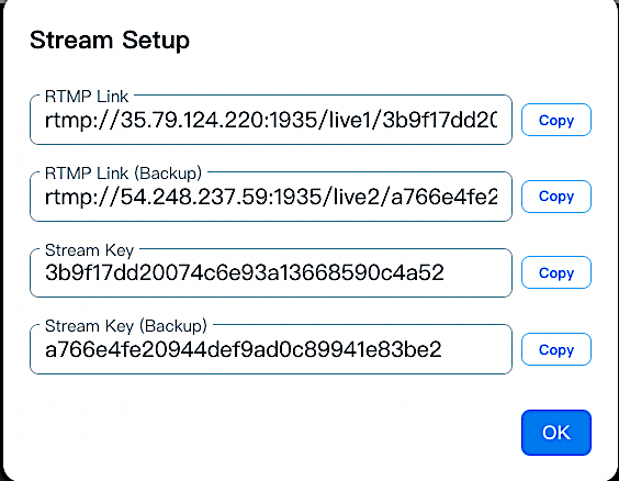 - RTMP鏈接:用於推送直播信號的主RTMP鏈接。