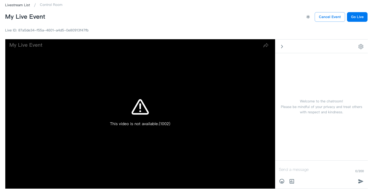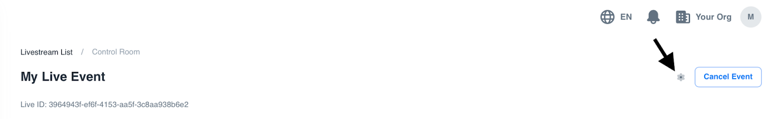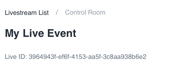 在控制室頁面的左上方,您將看到您活動的直播名稱和獨特的直播ID: