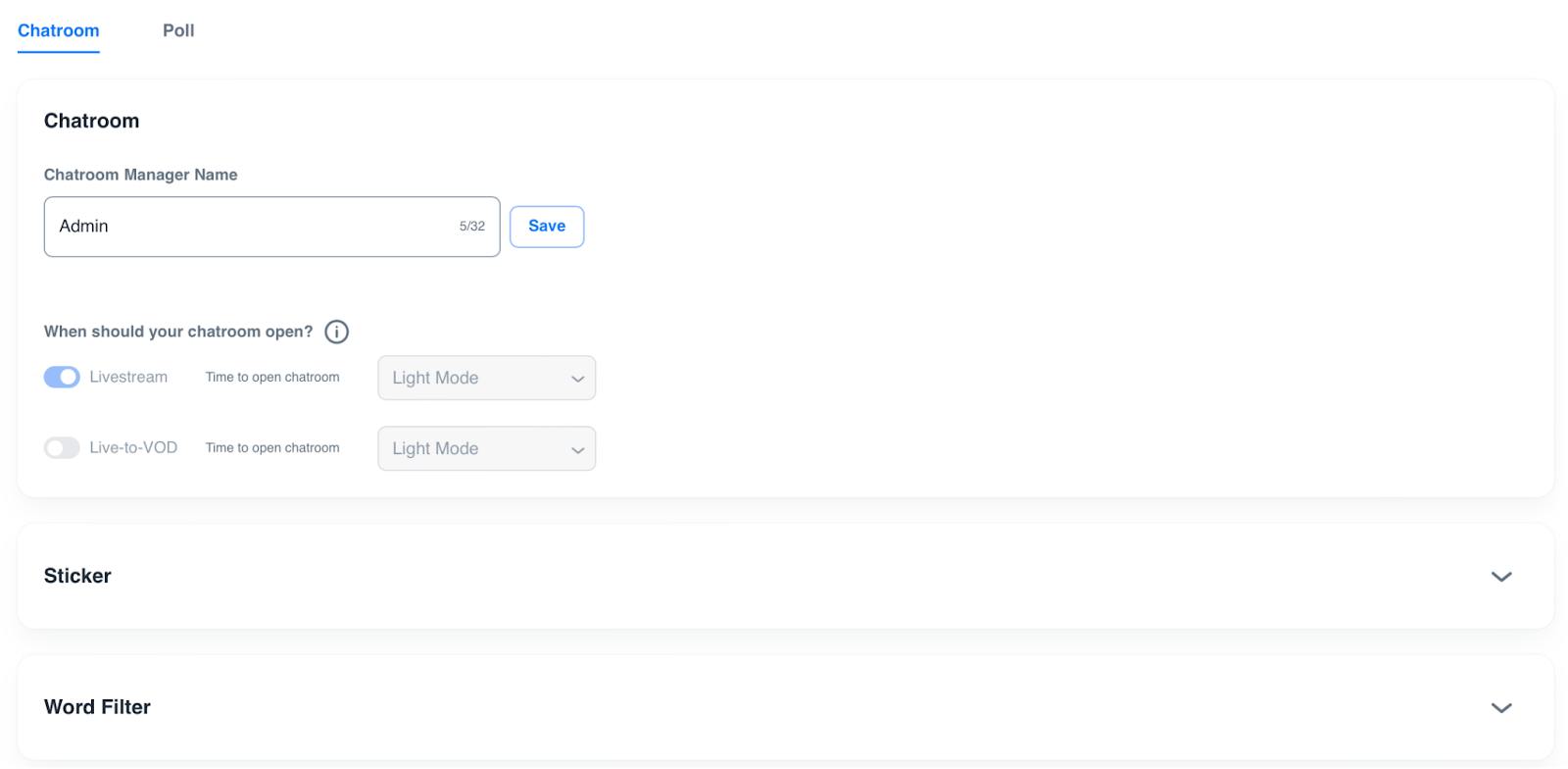 控制室提供了不同的功能來管理展示間/嵌入式iFrame播放器中可用的聊天室。有關更多詳細信息,請參閱「直播時管理聊天室」