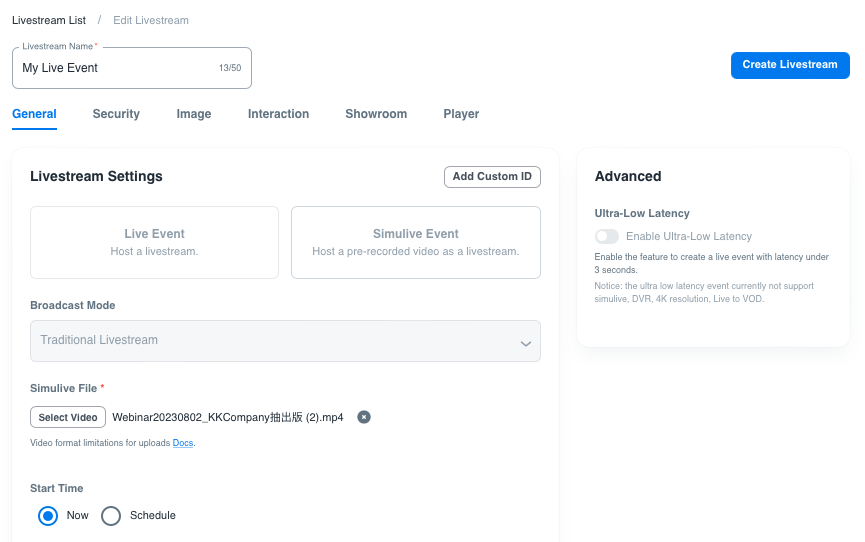 - 超低延遲(ULL)直播:重用直播活動時,此選項將無法編輯。