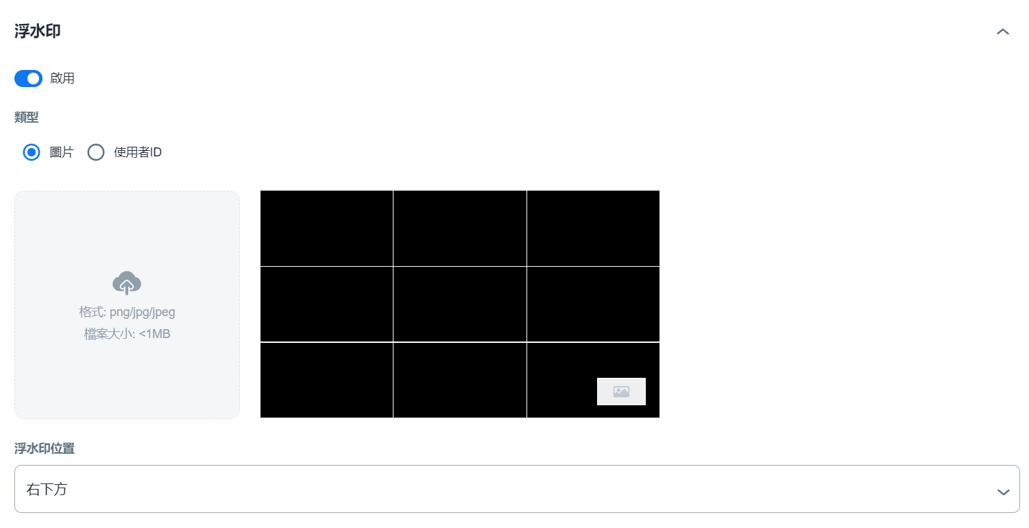 3. 啟用後,您可以選擇浮水印類型為「圖片」或「使用者ID」。