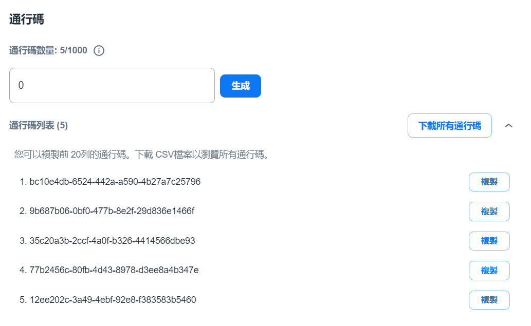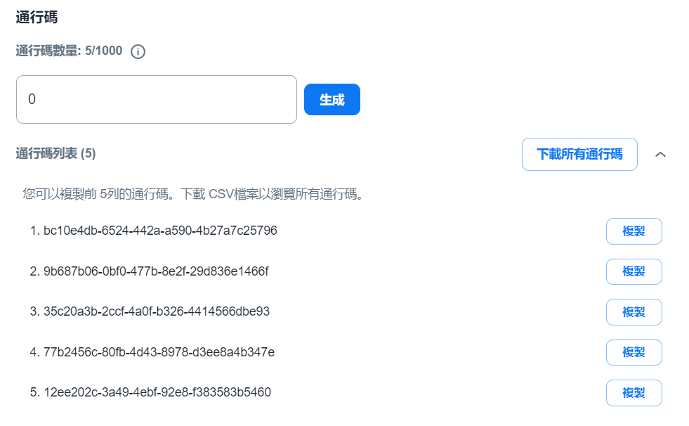 您可以輸入所需的通行碼數量,然後按「生成」按鈕來生成代碼。前五個通行碼將顯示,而其他則可以通過點擊「下載所有通行碼」按鈕以CSV文件形式下載。