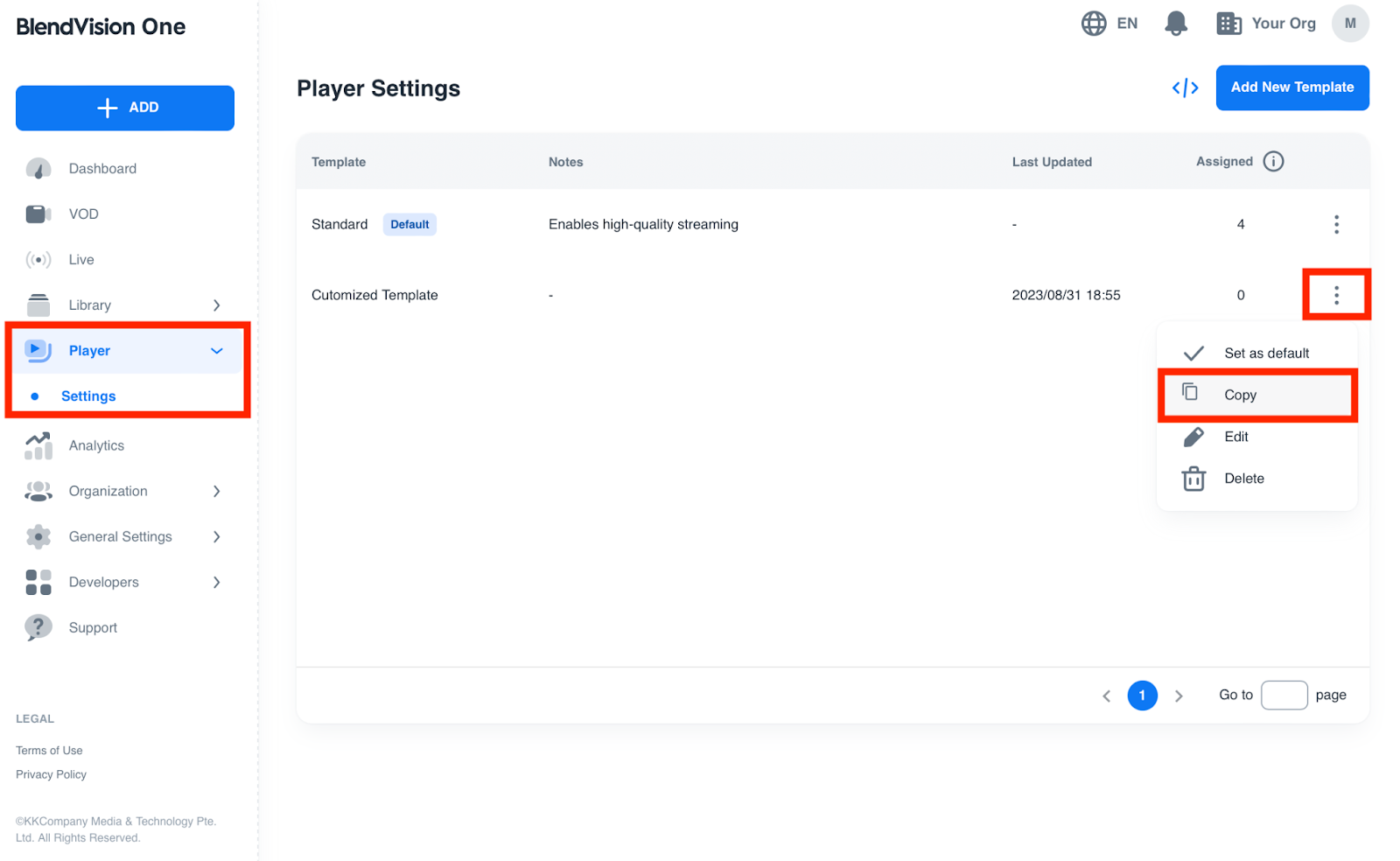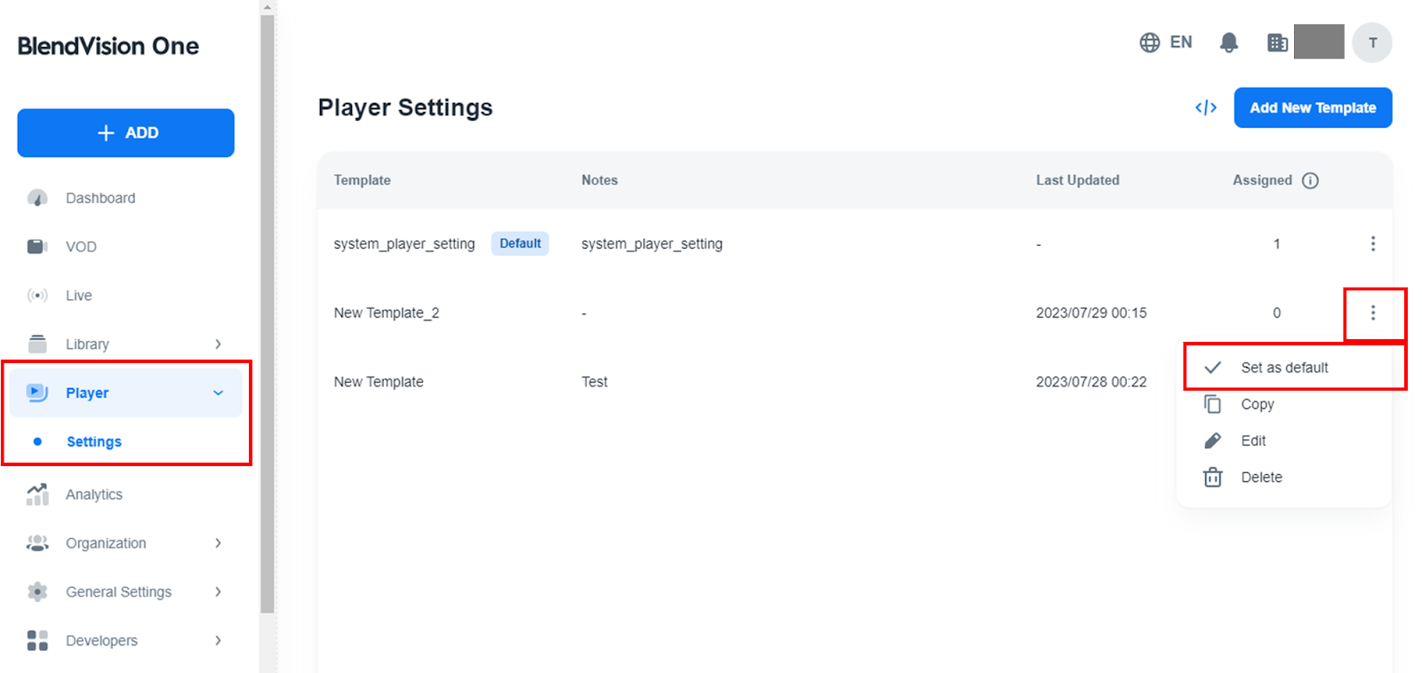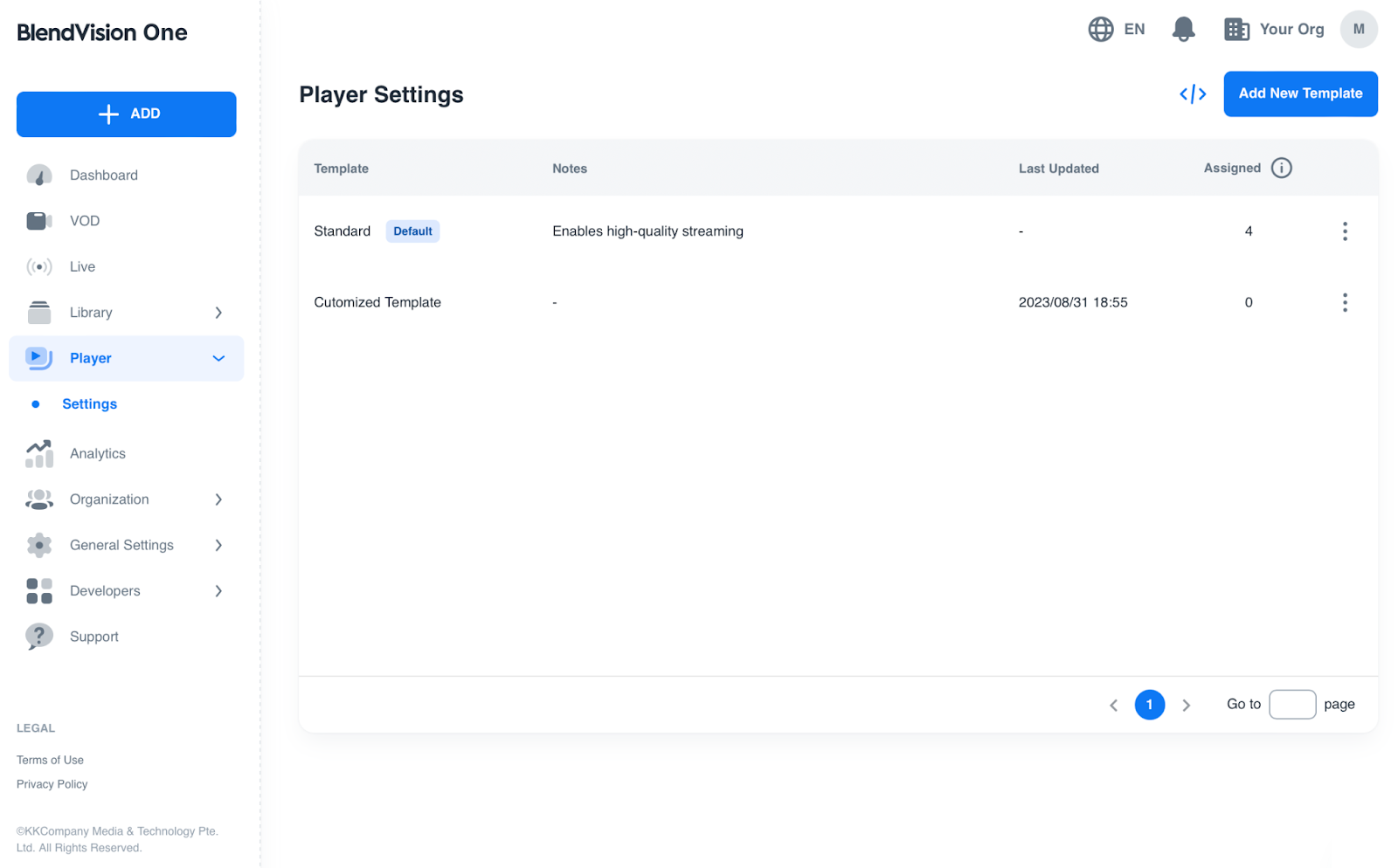 請注意,一次只能有一個預設範本,且一旦 VOD 或直播被創建,更改預設範本將不會影響它們。