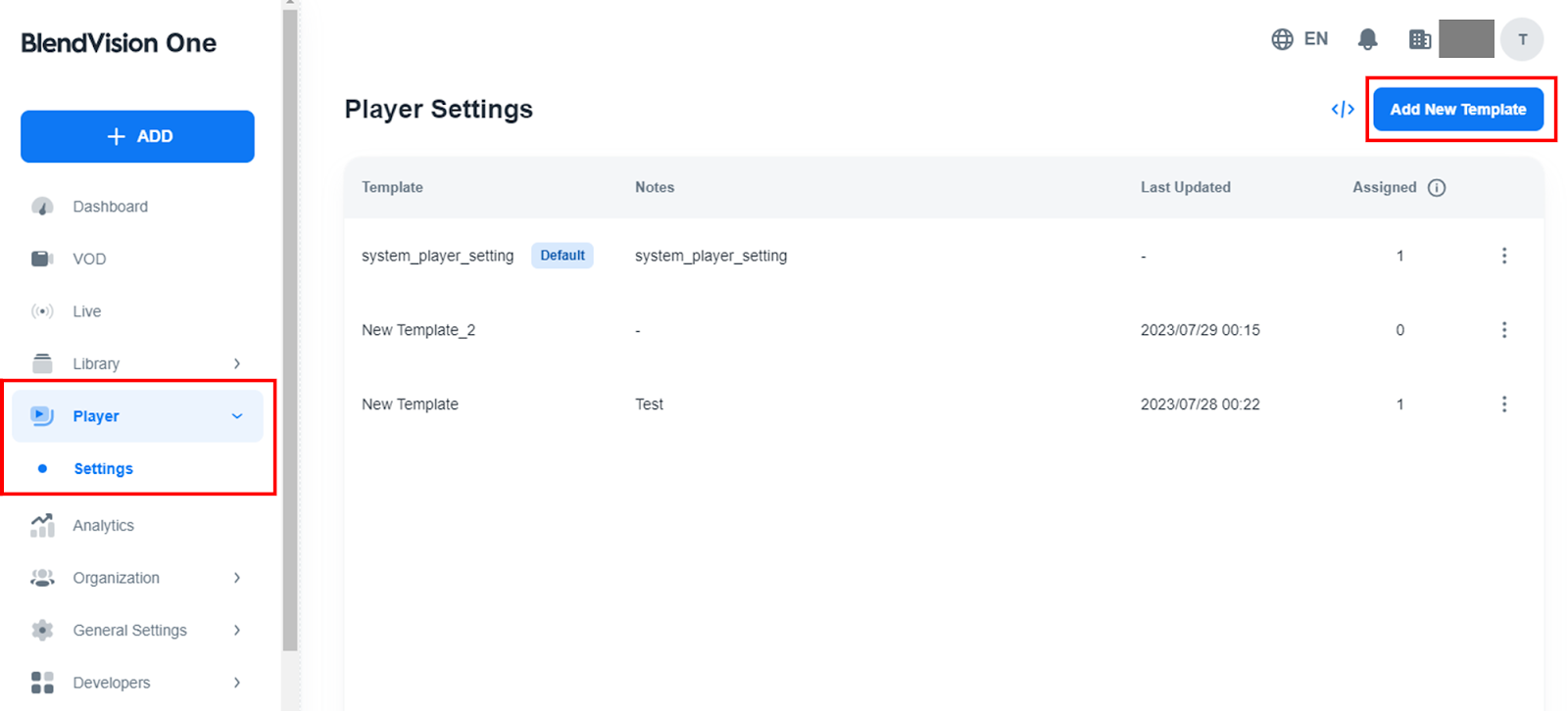2. 您可以查看「已指定」欄中使用所選範本的 VOD 和直播的數量。