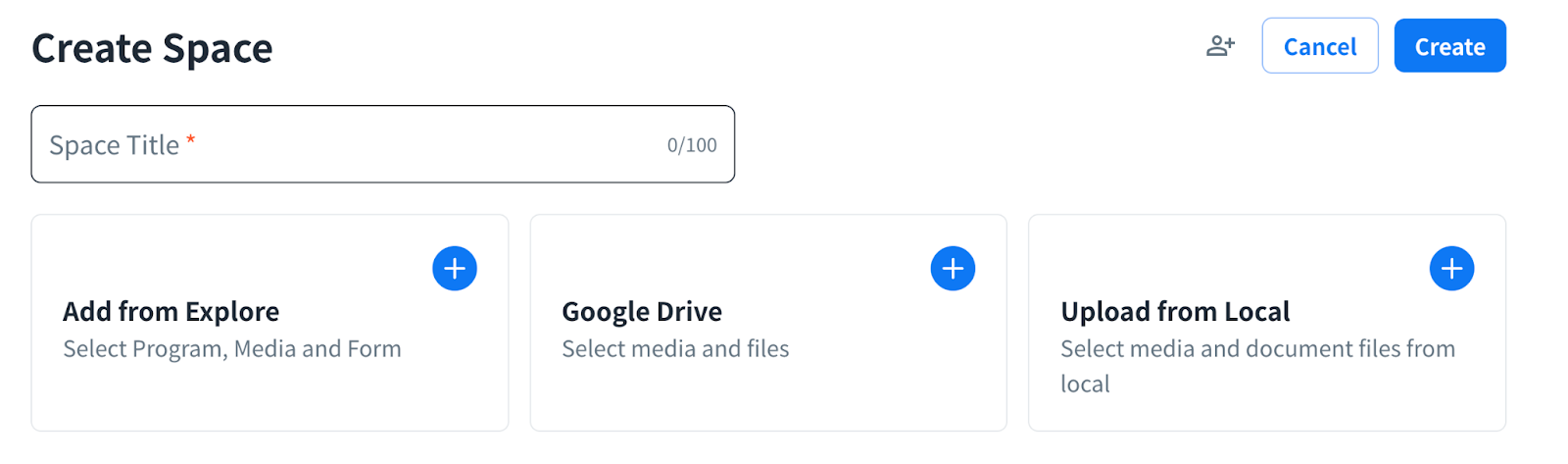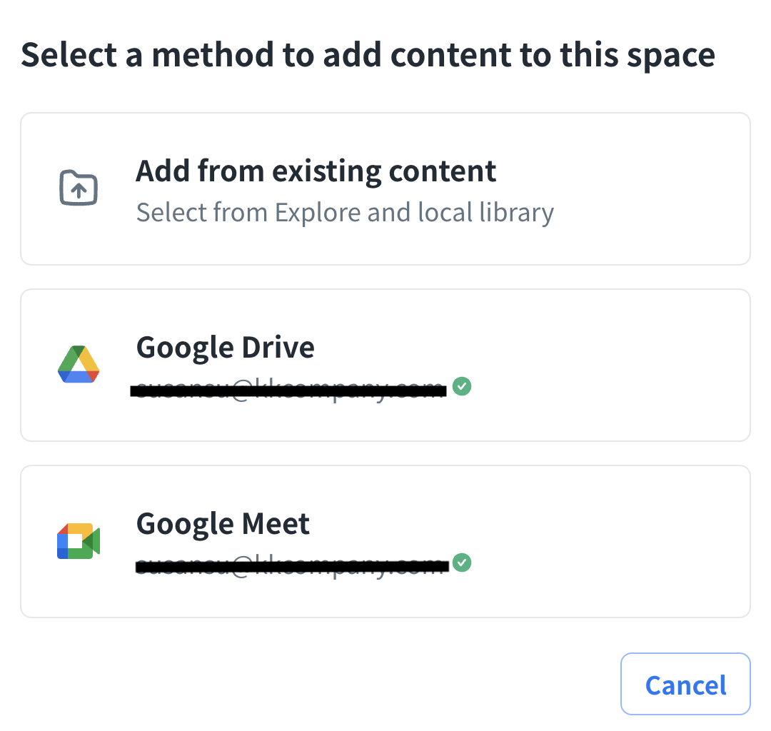 There are three methods to add your contents to a space: Add from existing content, Google Drive, and Google Meet.