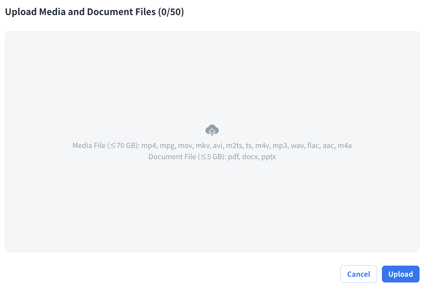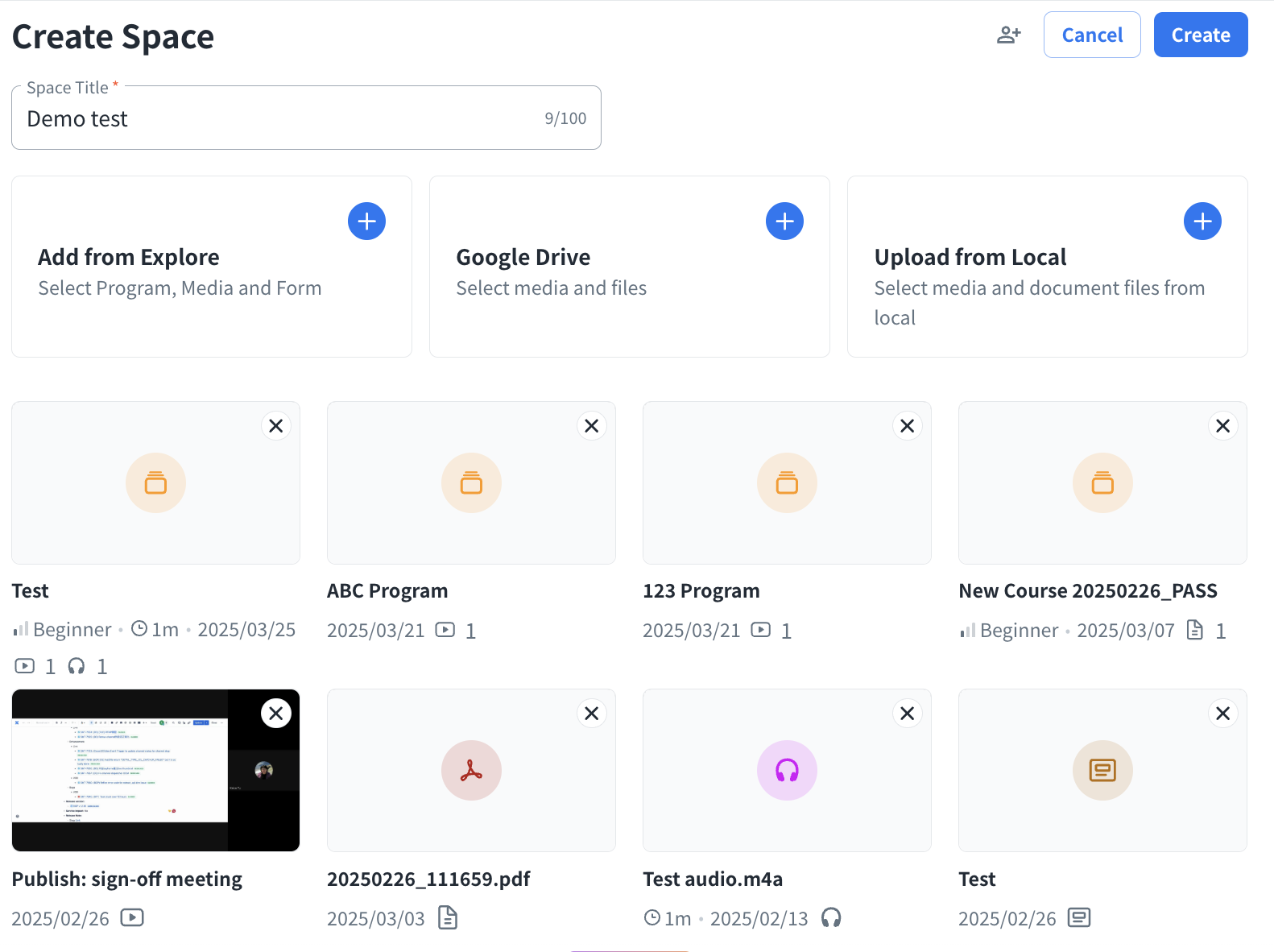 • Upload from Local: Click “Upload from Local" to select media and document files from local and click the “Upload” button to upload to the space.