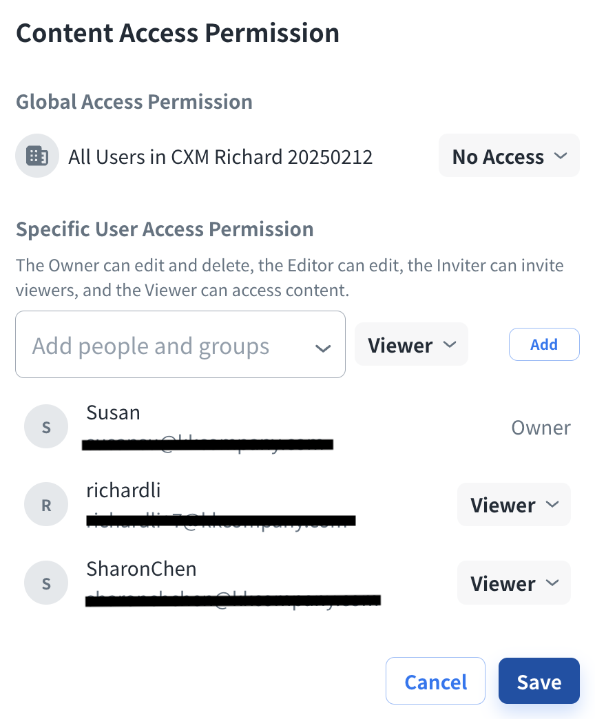 • Permission: Share the space to your users by clickingicon at the upper right corner, where you can grant the access permissions to the users or specific people/groups in the organization under Specific User Access Permission.