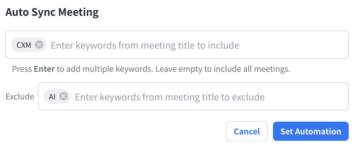 • Auto sync specific future meetings with keywords: Use Keywords to filter the meeting titles you want to auto sync and block the meeting titles you do not want to auto sync in the future. Click the “Set Automation” button to enable the rule.