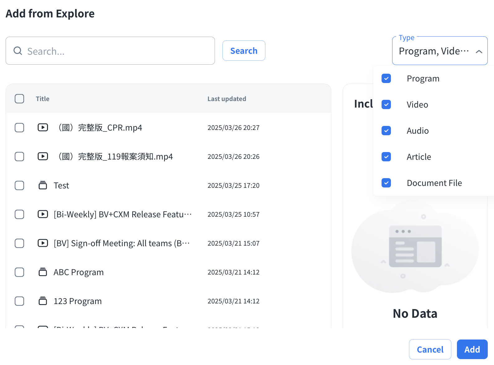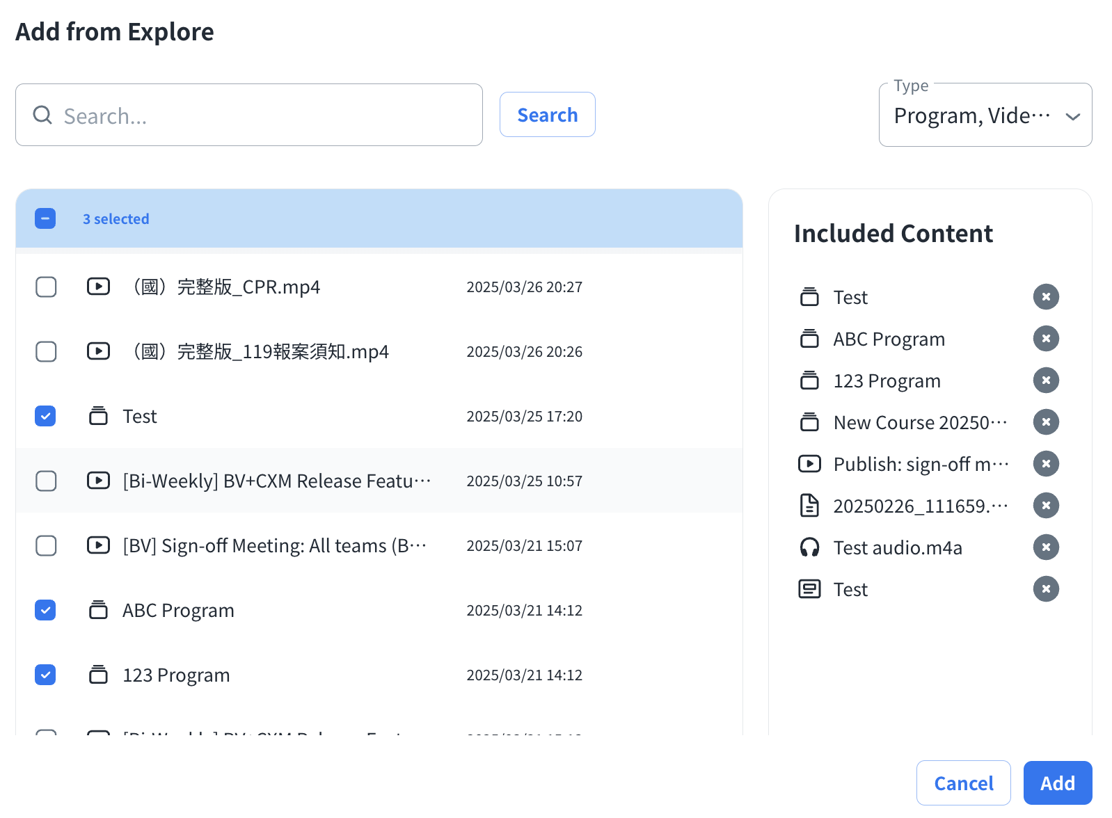 • Add from Explore: Click “Add from Explore” to select the programs, media, and forms you want to add.