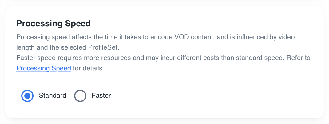 注意:總領先時間和使用成本將根據所選擇的處理速度、視頻長度和選擇的ProfileSet來確定。儘管「快速」提供了資源優先權,但總領先時間可能因上述設置的配置而有所不同。有關更多詳細信息,請參閱處理速度文章。