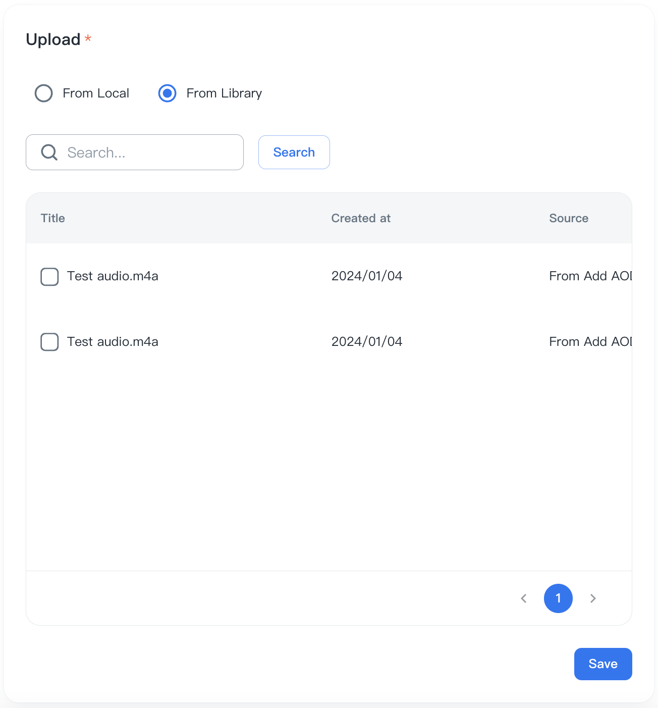 From Library: you can search and select audio files previously uploaded in the Audio Library. Check or uncheck source file items then click the “Save” button to proceed to the next step.