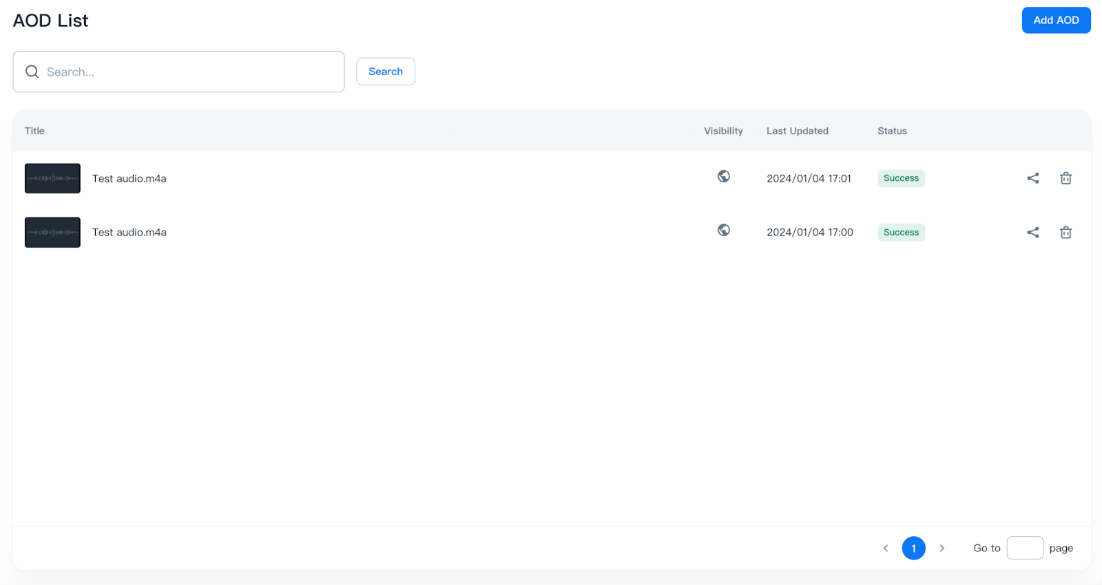 Once your file(s) are uploaded for encoding, you can confirm their status and details in the AOD list.