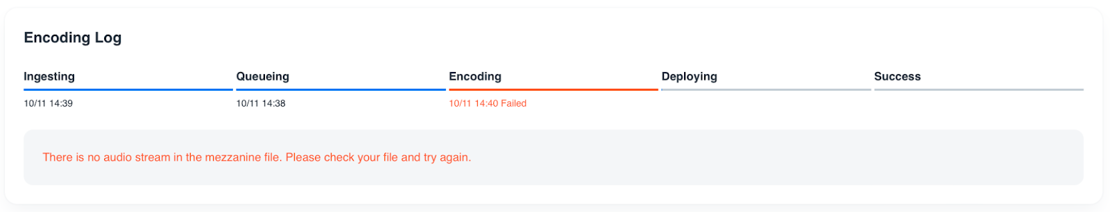 If the encoding job fails due to an error during encoding, you can check the error message for troubleshooting advice, or contact our support team.
