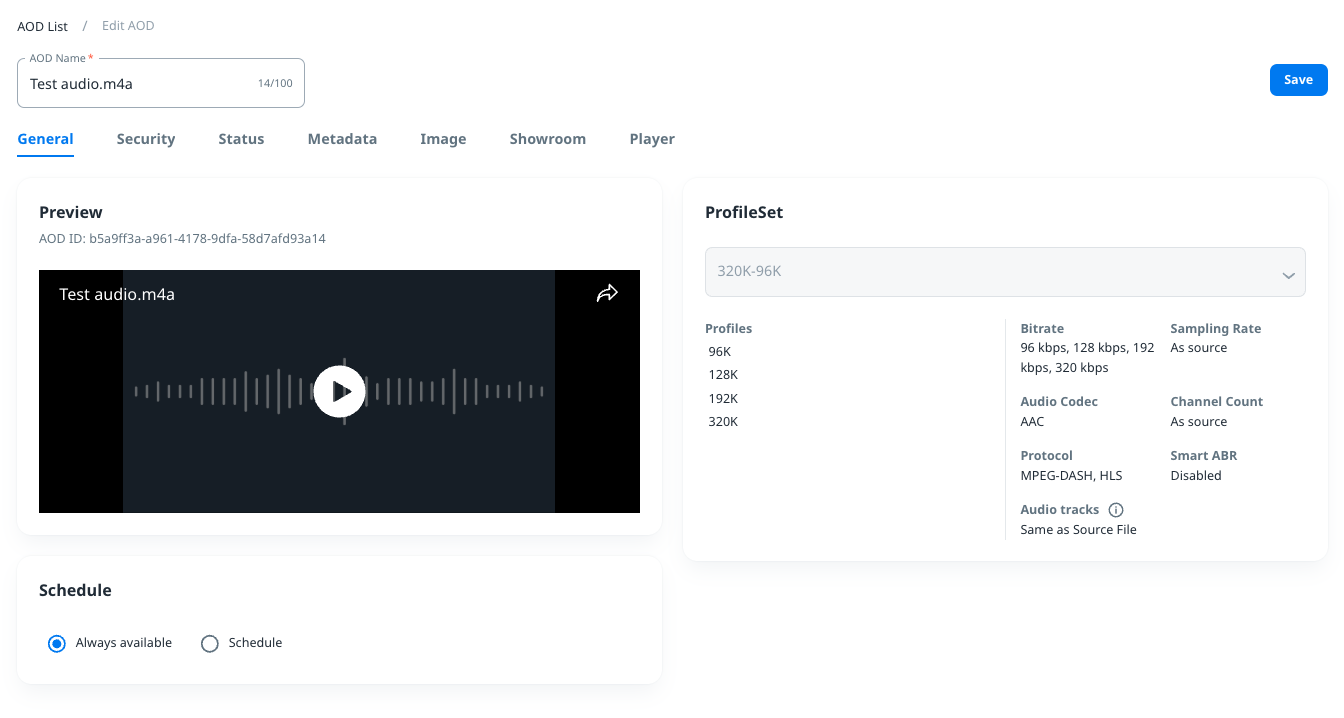 The AOD content will be available for playback once encoding is completed. You can opt to set a specific period for playback availability.
