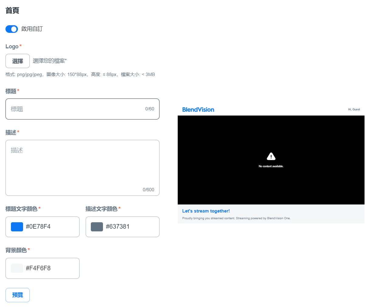 如果您想讓展示間更符合您的網站風格,可以自定展示間頁面的背景和按鈕顏色。